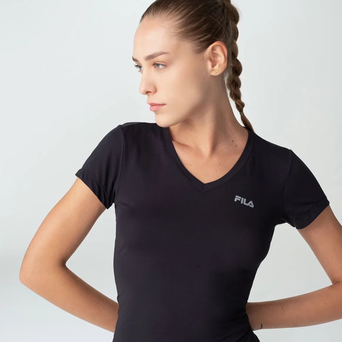 Camiseta feminina confeccionada em malha de poliamida com elastano. Modelagem alongada com manga curta. Seu tecido contém a tecnologia FLOW, que proporciona rápida secagem, mantendo o corpo na temperatura ideal para a prática esportiva. Possui decote em “V”, costuras laterais deslocadas para trás e logo Fila Letter em termo aplicado na parte frontal esquerda superior.