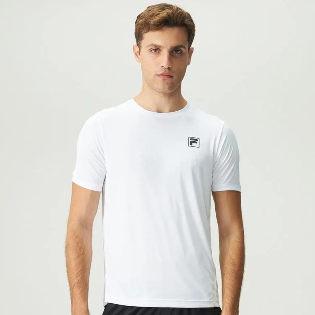 Camiseta masculina feita em malha leve de poliéster com elastano na modelagem regular. Possui manga curta e gola careca, ideal para a prática de exercícios. Seu tecido contém 2 tecnologias: FLOW, que mantém o corpo na temperatura ideal para a prática esportiva, e UV PROTECTION, que fornece proteção solar FPS 50+ dos raios UVA e UVB. Possui costuras Flat Seam (sem atrito com o corpo), laterais descoladas para frente, cobre gola FILA Running e ombros deslocados.