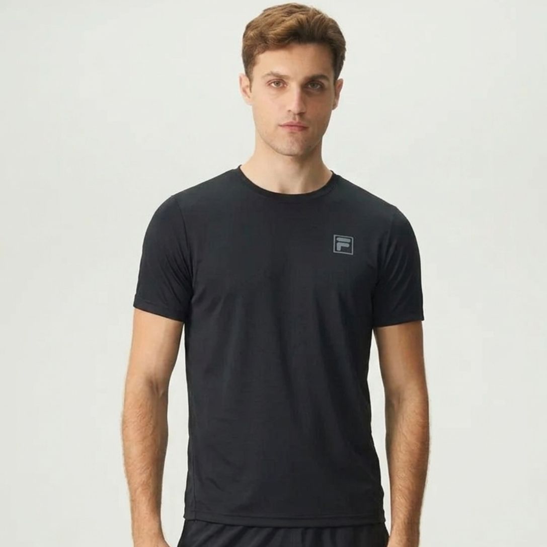 Camiseta masculina feita em malha leve de poliéster com elastano na modelagem regular. Possui manga curta e gola careca, ideal para a prática de exercícios. Seu tecido contém 2 tecnologias: FLOW, que mantém o corpo na temperatura ideal para a prática esportiva, e UV PROTECTION, que fornece proteção solar FPS 50+ dos raios UVA e UVB. Possui costuras Flat Seam (sem atrito com o corpo), laterais descoladas para frente, cobre gola FILA Running e ombros deslocados.