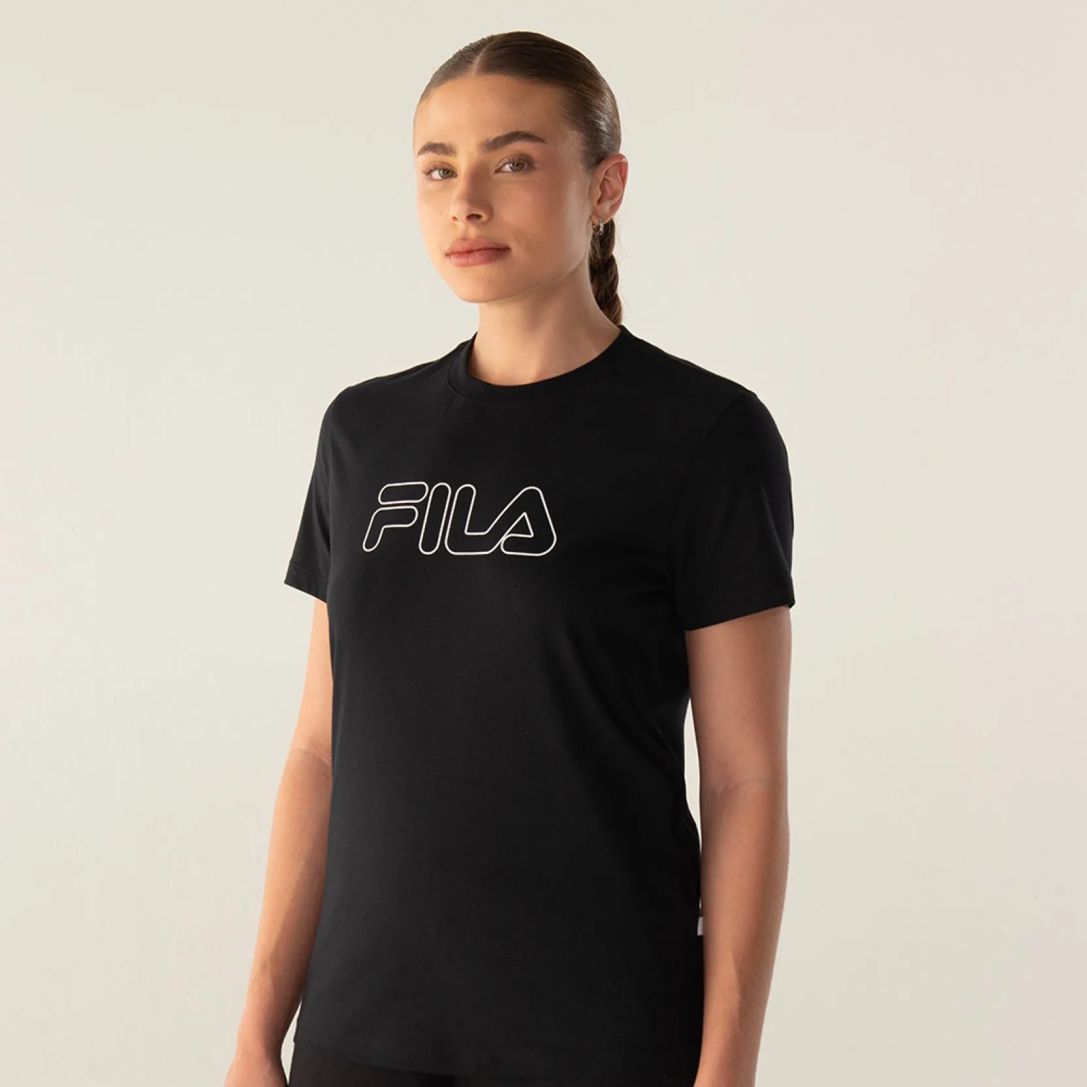 Camiseta feminina confeccionada 100% em algodão, modelagem conforto (mais solta ao corpo) e manga curta. Traz maxi logo FILA Letter Outline e acabamento pespontado na gola careca.