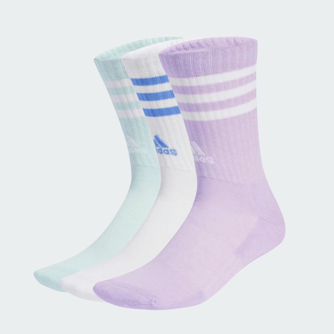 Kit com três pares de meias femininas adidas, com design de cano longo ideal para treinos ou uso casual. Confeccionadas com amortecimento na sola, inclusive no calcanhar e nos dedos, proporcionam conforto extra e absorção de impacto. O suporte no arco do pé garante mais estabilidade durante os movimentos, enquanto as costuras seladas nos dedos reduzem o atrito e aumentam o bem-estar.