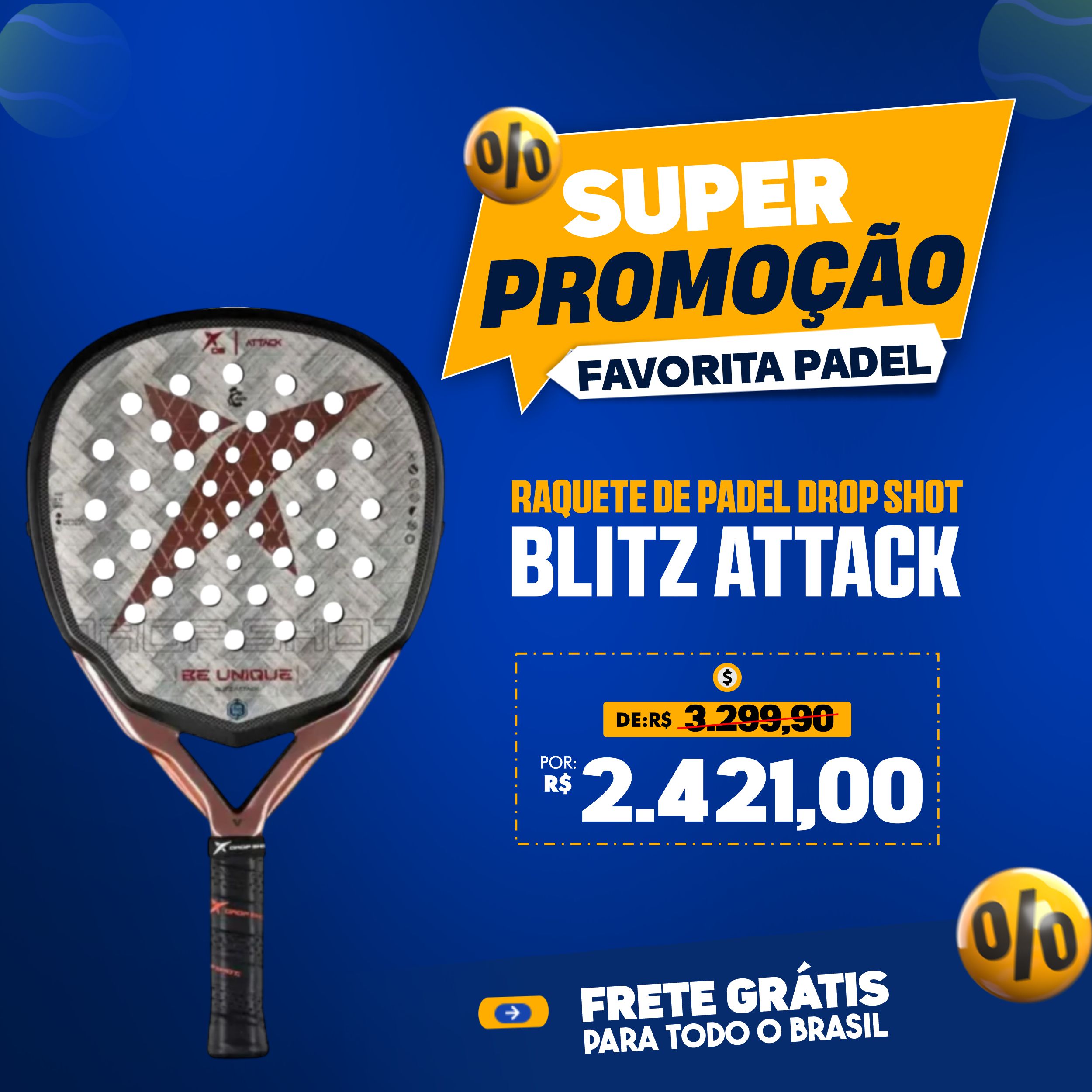 A nova DROP SHOT BLITZ ATTACK chega ao mercado com a inovadora tecnologia SBS (Smart Balance System), permitindo ajuste personalizado de equilibrio e desempenho. Desenvolvida para jogadores de nivel intermediário a avançado, é a escolha ideal para quem busca potência, controle e versatilidade em cada golpe.