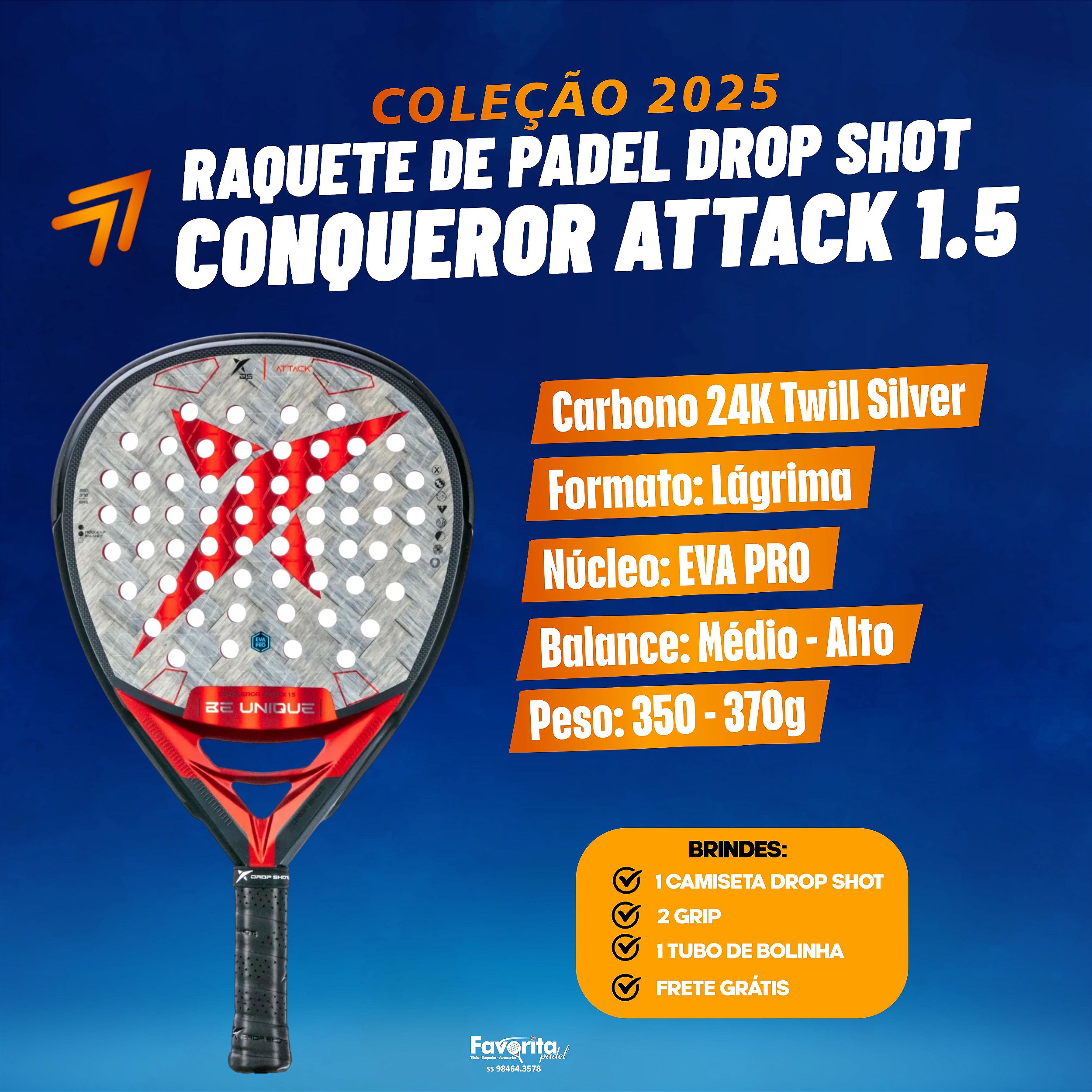 Na DROP SHOT, sabemos que atletas de alto rendimento precisam de um equipamento à altura do seu talento. Por isso, desenvolvemos a Conqueror Attack 1.5 para oferecer potência, controle e tecnologia de ponta, elevando sua performance a um novo patamar.