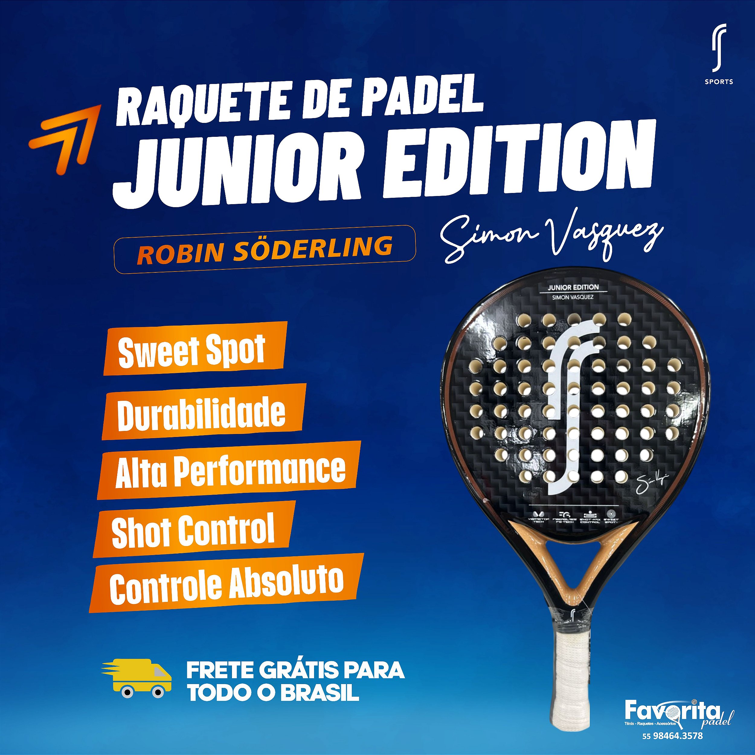 DNA de Campeão: Com o design oficial inspirado na raquete de Simon Vasquez, seu filho entra em quadra com a mentalidade de um vencedor do World Padel Tour.