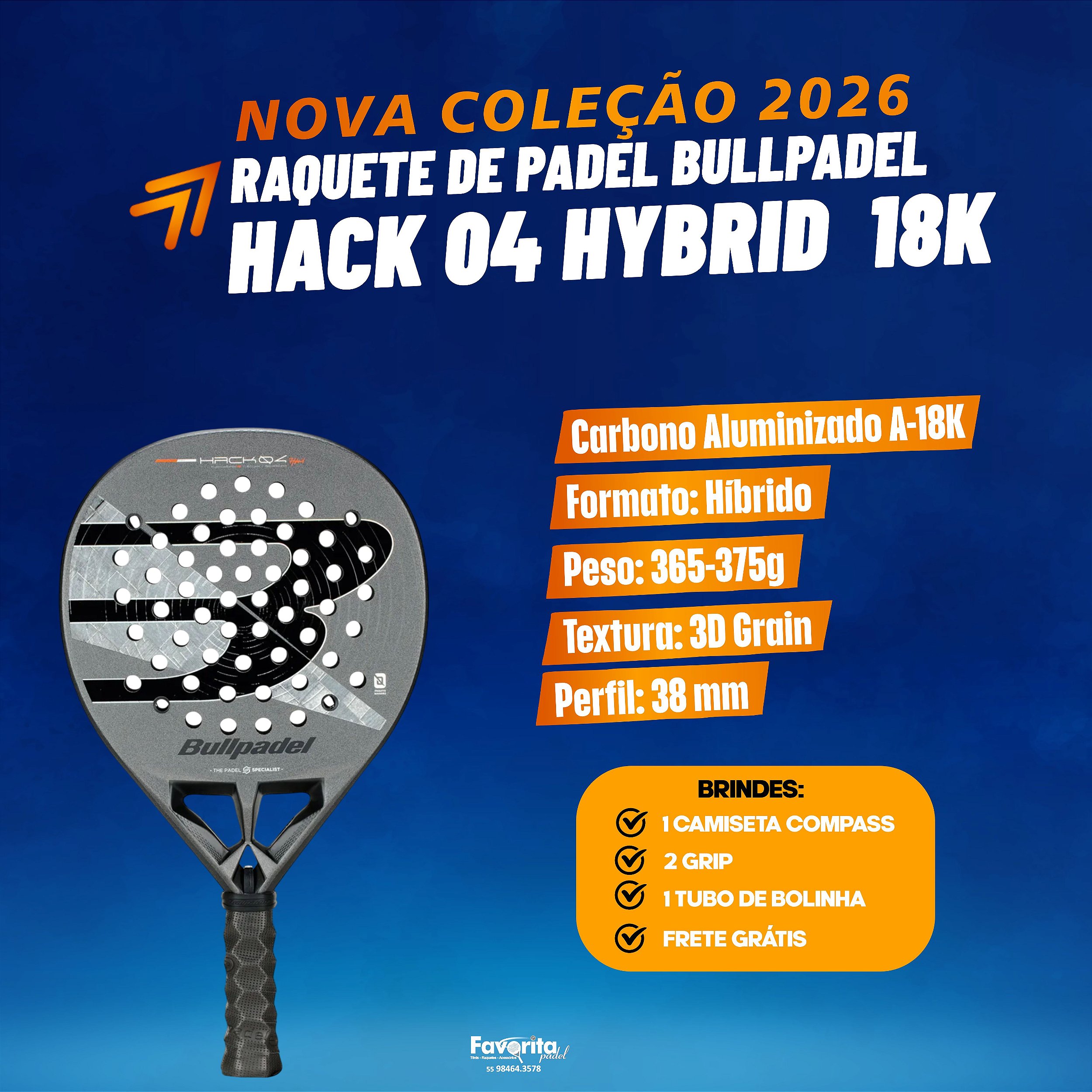 A Raquete Bullpadel Hack 04 Hybrid 26 é o modelo da linha Hack desenvolvido para jogadores avançados que buscam dominar o contra-ataque com controle e potência. Com formato híbrido e novas tecnologias do Bullpadel Lab, oferece jogabilidade dinâmica, manuseio rápido e resposta sólida em situações de alta pressão, transformando defesa em ataque com precisão.