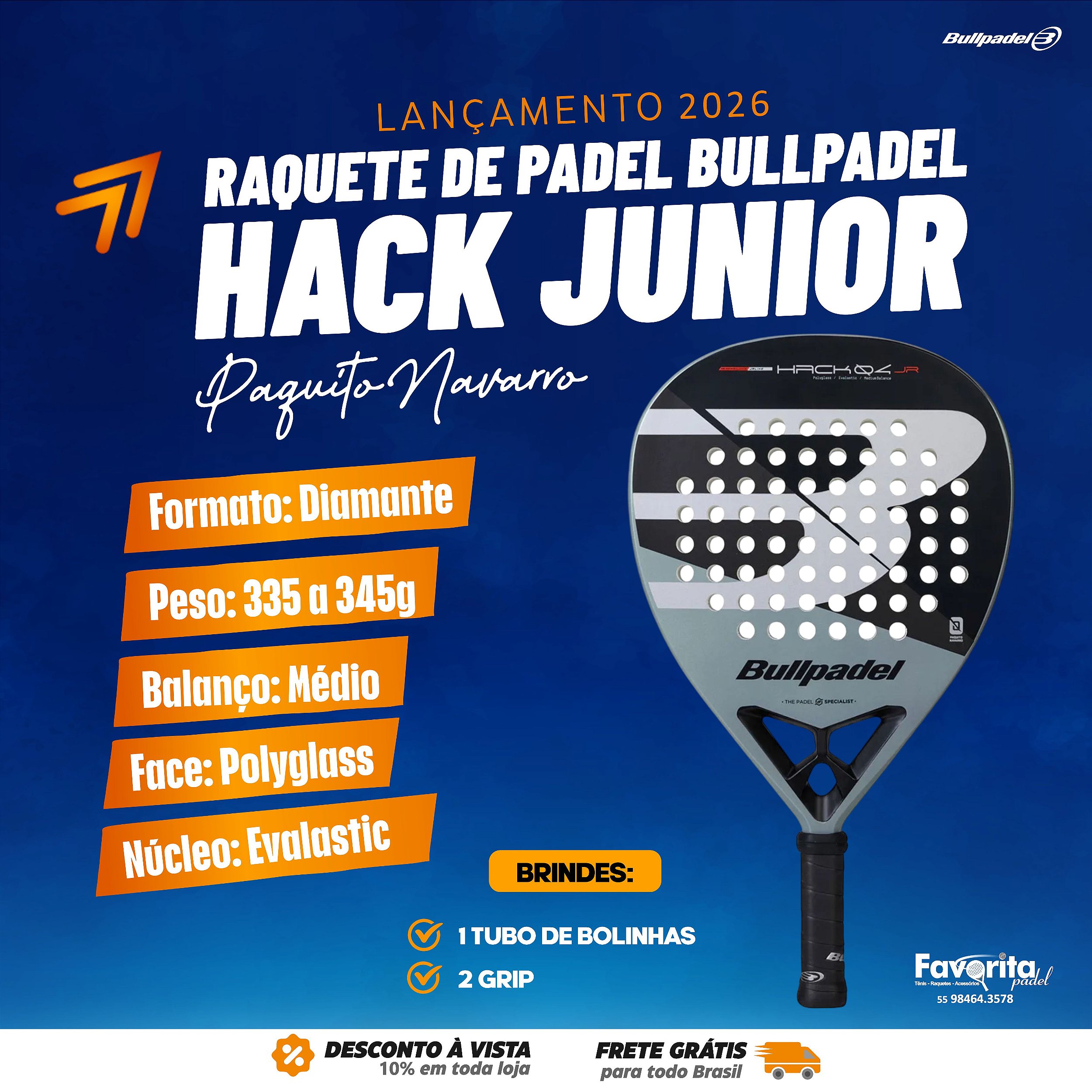 A Raquete Bullpadel Hack JR 26 é a réplica oficial do modelo utilizado por Paquito Navarro, desenvolvida especialmente para jogadores junior com alto nível de jogo. Adaptada às necessidades do público jovem, esta raquete mantém o formato em diamante e o coração Hack, oferecendo potência, rigidez estrutural e controle para a evolução do jogo ofensivo.