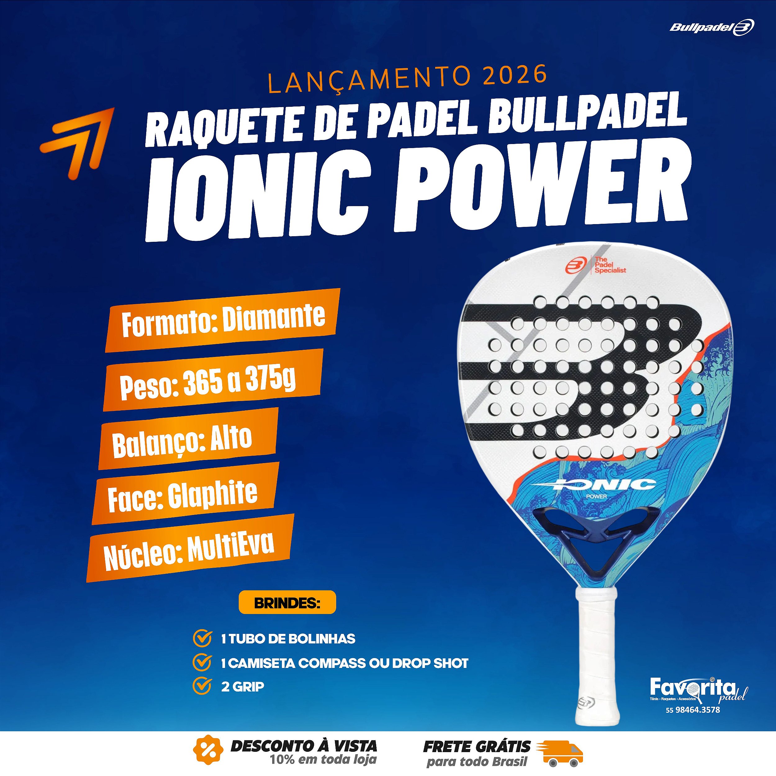 A Raquete Bullpadel Ionic Power 26 foi desenvolvida para jogadores intermediários que buscam aumentar a potência do jogo sem perder manejabilidade. Com perfil ofensivo, este modelo combina formato em diamante, balanço alto e materiais que favorecem golpes de ataque mais agressivos e eficientes em quadra.