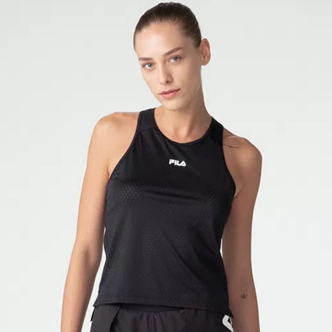 Regata feminina confeccionada em malha telada de poliéster para maior respirabilidade durante a prática de exercícios. Modelagem alongada com decote arredondado e costas nadador. Seu tecido contém a tecnologia FLOW, que proporciona rápida secagem, mantendo o corpo na temperatura ideal para a prática esportiva. Possui cavas com acabamento limpo, queda de ombro, aberturas laterais na barra, cobregola personalizado, barra traseira maior que a barra frontal e logo Fila Letter em relevo centralizado na parte frontal superior.