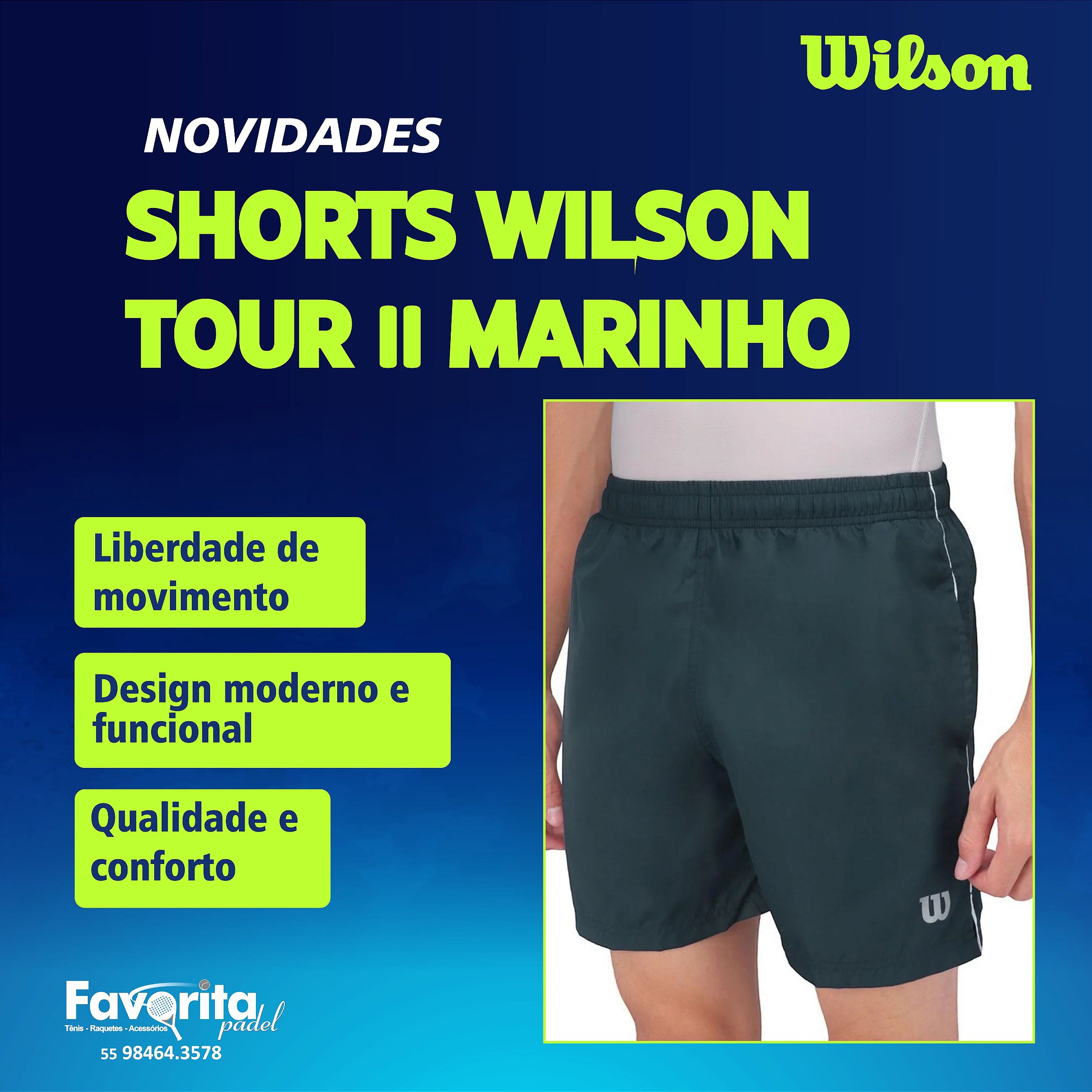 Foi desenvolvido com foco em quem preza liberdade de movimento, leveza e bem-estar. Conheça as características da Shorts Wilson Tour II Marinho. 100% Poliéster, forro: 100% Poliéster; cós com elástico e cordão para melhor ajuste, bolsos laterais, logo Wilson na perna esquerda, barra com fendas para mobilidade.