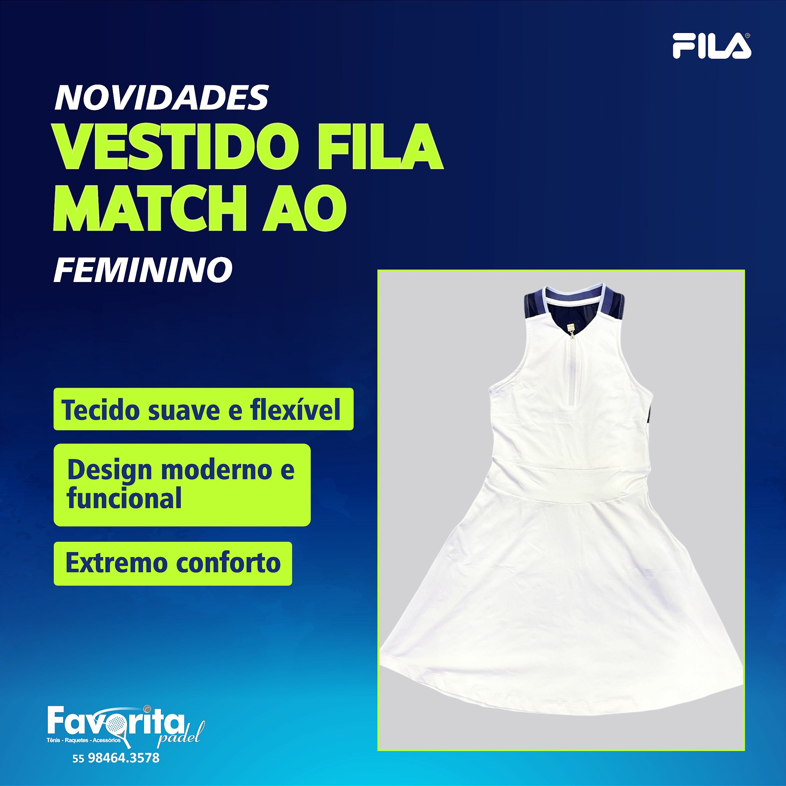 O Vestido Feminino FILA Match AO combina elegância e funcionalidade com modelagem slim e saia evasê. Feito em poliamida com elastano e detalhes em mesh, oferece tecnologias Flow e FPS 50+ para respirabilidade e proteção solar. Possui gola em retilínea, decote V com zíper, forro frontal e costas em decote nadador. Recortes modelam o corpo, enquanto acabamentos trançados e viés interno garantem conforto. O F-Box em termo nas costas adiciona um toque moderno.